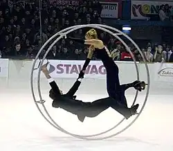 Wheel gymnasts do exercises in a large wheel known as the Rhönrad, gymnastics wheel, gym wheel, or German wheel.