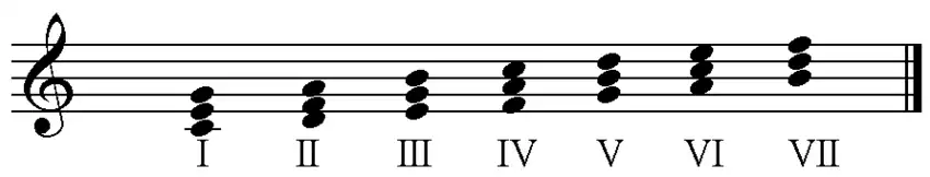 We often think of triads as being built on top of the scale of a particular key. As there are 7 notes in the standard major or minor scale, there are also 7 corresponding chords. There is a whole language of chord names to be familiar with (in Roman numerals).