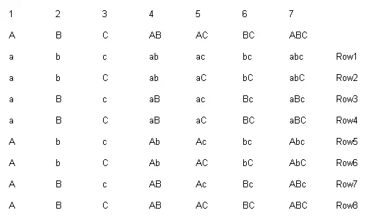 - When the fifth column is reached, aC and Ac are removed, but this leaves AC. As with step 4, in rows containing AC, any element which incorporates AC should be removed. This will result in the removal of AbC in row 6.