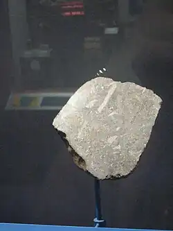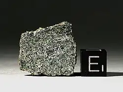 Northwest Africa 7325 is a unique igneous meteorite which crystallized as a basalt on a large asteroid or planetesimal approximately 4.56 billion years ago, classified as an ungrouped achondrite, and is notable for its green fusion crust and high-magnesium/low-iron composition.[7][8] It was purchased from anonymous finders in a marketplace in Erfoud, Morocco in April 2012.[8] The original find was composed of 35 fragments with a combined weight of approximately 345 grams (12.2 oz), however many additional fragments with a total weight of over 1,100 grams (39 oz) were subsequently recovered.[9]