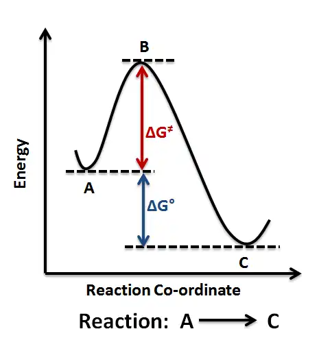 In the above reaction coordinate diagram, the reactants, A, produce the products, C (as displayed at the bottom of the graph). The graph is evidently exothermic, as energy is being released. The △G≠ represents the activation energy while B represents the activation complex. The △G° represents the ending energy. Since this graph is exothermic, the ending energy will be a negative value (as energy has been lost). The formula for △G° (heat of reaction) is (products minus reactants = ending energy).