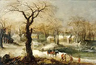 {{free media}}The cycle of the seasons fascinated 17th-century Europeans, but the shifts in the tilt of the earth that causes them were not understood. Winter was especially hard then; Europe was in the middle of a little ice age and it was much colder than today. The Southern Netherlands was also in the midst of a war, and ill-paid soldiers terrorized the peasants. Here, on the right, the landscapist de Momper uses subdued color and tonal unity to suggest the bleakness of a late winter afternoon, complemented by an intricate, stark pattern of barren branches against the sky.