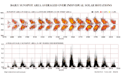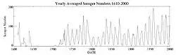 {{free media}}"As shown in the figure [on the right], there is a paucity of sunspots during 1645-1715 and, to a lesser extent, again during 1800-1840. These intervals of low sunspot numbers are known as the Maunder Sunspot Minimum and Dalton Sunspot Minimum, respectively."[35]