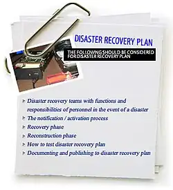 - Disaster Recovery involves a set of policies, tools and procedures to enable the recovery or continuation of vital technology infrastructure and systems following a natural or human-induced disaster.[15]