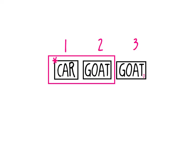 Right? So we choose door one (*). The host opens a door with a goat (o). So, based on this, the probability must be 1/2 of the time or 50%. Because of this, it doesn't matter if you stay or switch.