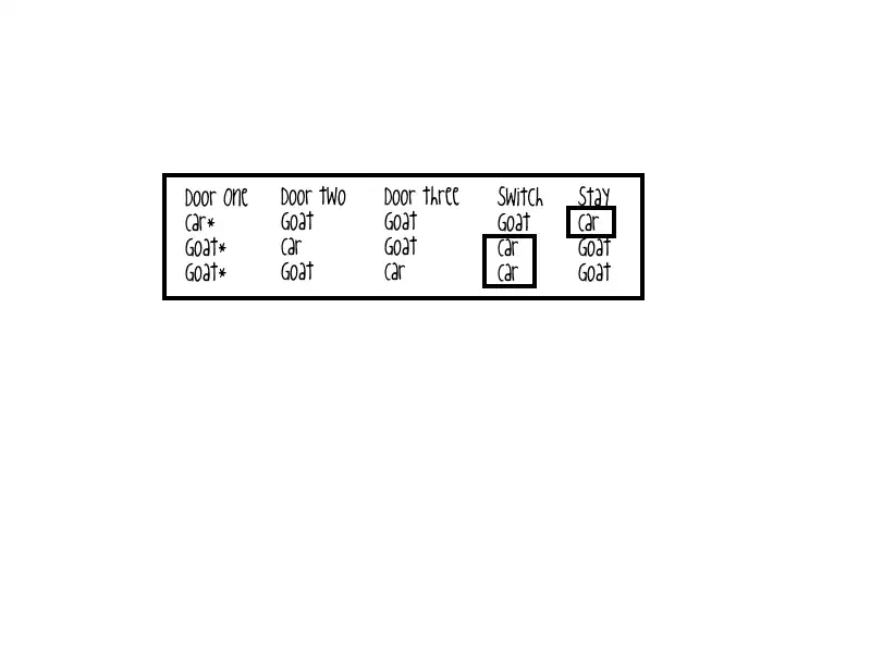- To figure out the outcomes of staying or switching, let's assume that you always choose door one. The results would be as follows: