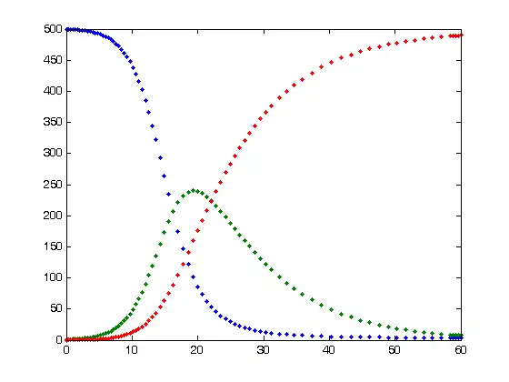 Blue represents the number of susceptible people. At the beginning of the epidemic, the number of susceptible (blue) people decreases as the number of infected (green) people increases. Gradually the number of recovered (red) people increases. The point at which the maximum number of people are infected at one time is called the height of the epidemic, after which the number of infected people falls, because there are fewer susceptible people to infect. In this particular model, after the epidemic is over, all of the people have been infected and recovered. This is not always the case; sometimes some susceptible people remain uninfected.