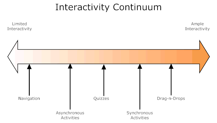Interactivity should be seen not as a single type of instruction but one that is on a continuum. Where the interation for any particular course lies depends on the conditions of the learning environment and can take on a multitude of formats.