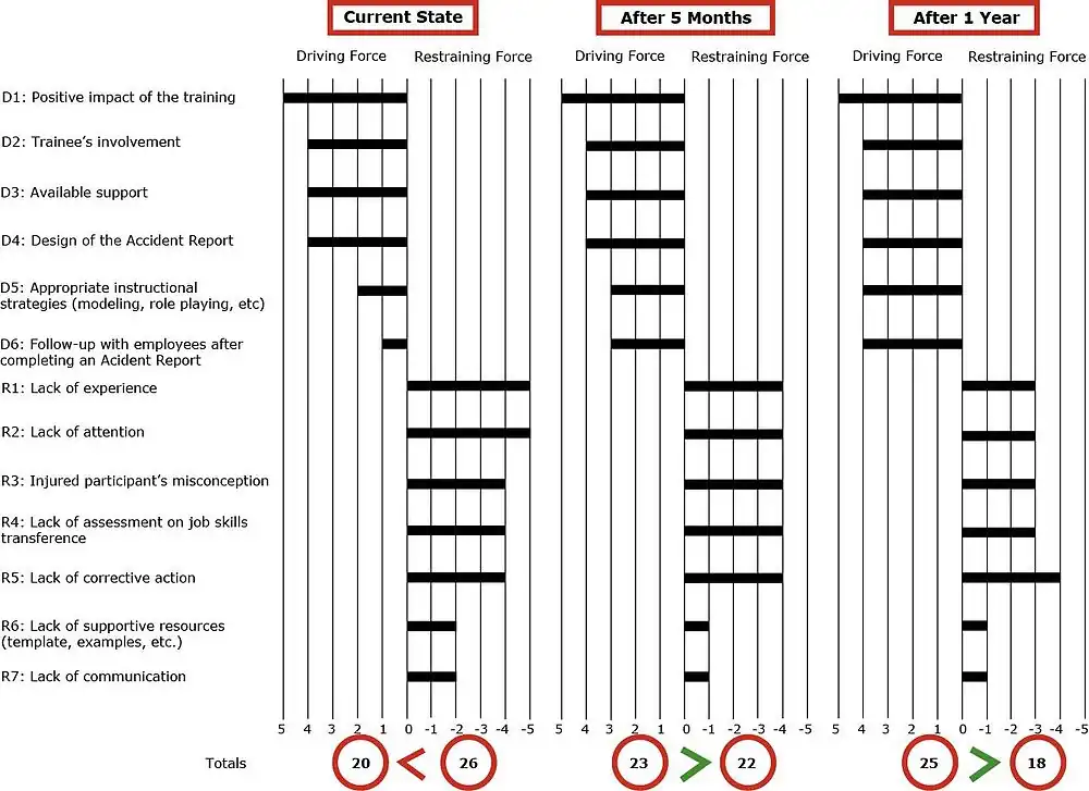 - Identify the changing variations between the scores of driving force and restraining force during every state, and