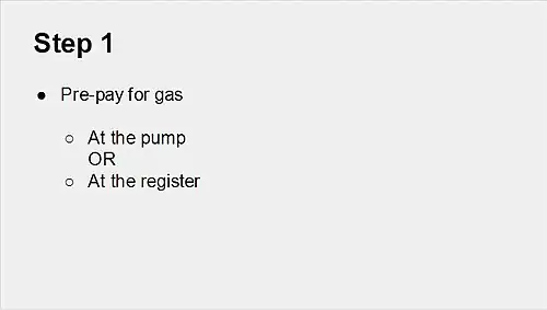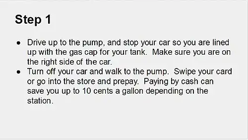 You should notice that this slide contains more information than is necessary for this particular presentation. Remember - the goal is just to identify the steps to PUMP the gas. Sometimes cutting out extra content can be the hardest part of creating a presentation! There is usually a lot of information we want to give, but when we stick to the goal we can usually trim a lot of extra information. Take a look at how we can edit to make sure we are sticking to our goal: