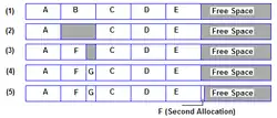 Defragmentation reduces the amount of space or "fragmentation" in a file space. By using compaction, it creates larger regions of free space. The image to the side of the text represents the allocation of the free space as well as the combining of the files in order to defragment the hard drive.