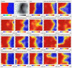 A self-organizing map showing US Congress voting patterns visualized in Synapse.