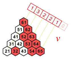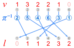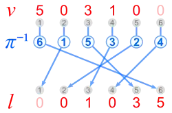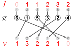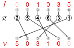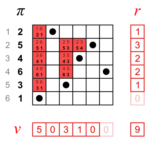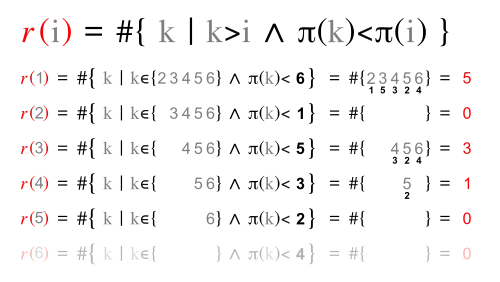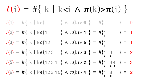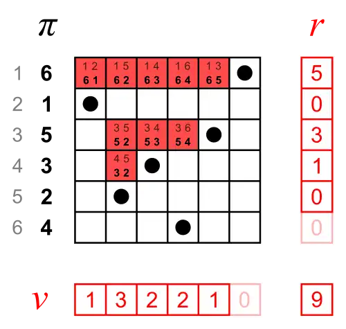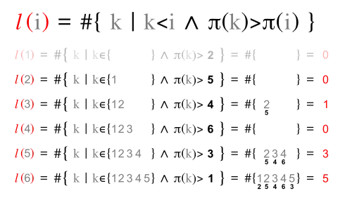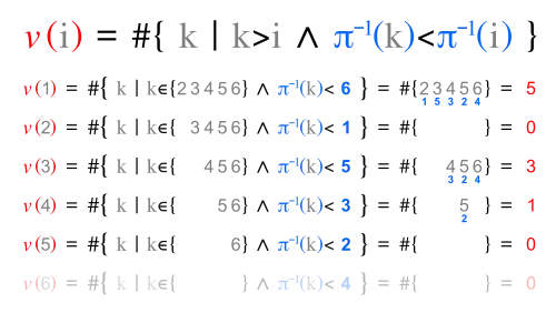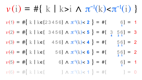 Inversion vector v and left inversion count l are shown next to each other, because they have the same digits.