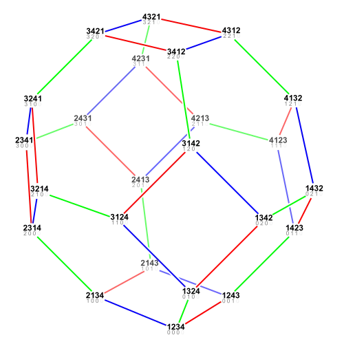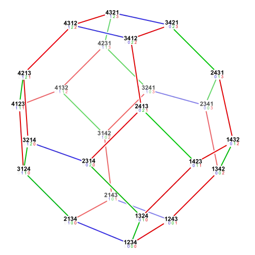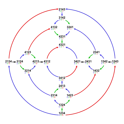 The following sortable table shows the 24 permutations of four elements with their place-based inversion sets, inversion related vectors and inversion numbers.