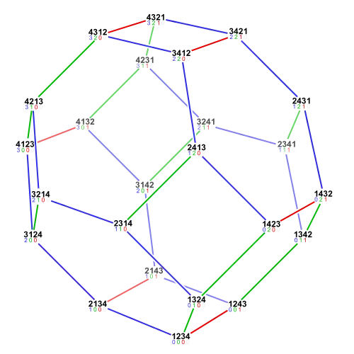 I: p1 = {2,5,4,6,3,1} I: p2 = {6,1,5,3,2,4} I: ToInversionVector[p1] O: {5,0,3,1,0} I: ToInversionVector[p2] O: {1,3,2,2,1} I: ToOrderedPairs[PermutationGraph[p1]] O: {{2,1},{3,1},{4,1},{5,1},{6,1},{4,3},{5,3},{6,3},{5,4},{1,2},{1,3},{1,4},{1,5},{1,6},{3,4},{3,5},{3,6},{4,5}} I: ToOrderedPairs[PermutationGraph[p2]] O: {{6,1},{3,2},{5,2},{6,2},{5,3},{6,3},{5,4},{6,4},{6,5},{1,6},{2,3},{2,5},{2,6},{3,5},{3,6},{4,5},{4,6},{5,6}}