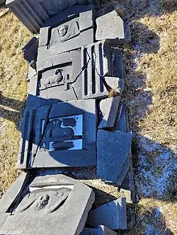 The skull-and-crossbones grave refers to the remains of a chest tomb located within the Bennett's Lane cemetery. It was rediscovered by the Knights of Columbus Dalton Council No. 1448 in 2013 during a cemetery clean-up.[27] The chest tomb includes an engraving of a skull and crossbones on one of the end stones and is accompanied by other iconography along the top of the tomb.
