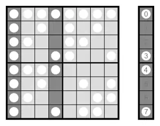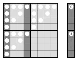 The result is the separate column on the right. It has a dot in every row without dotless dark matrix fields.