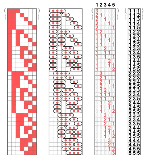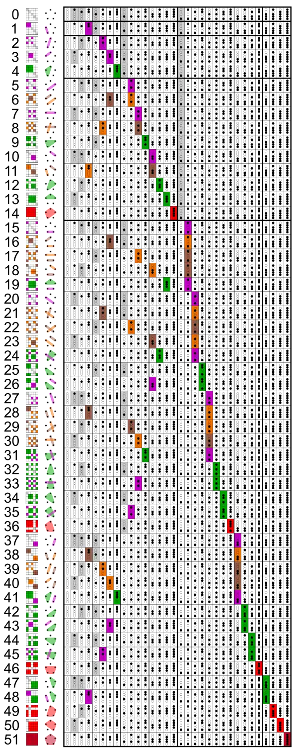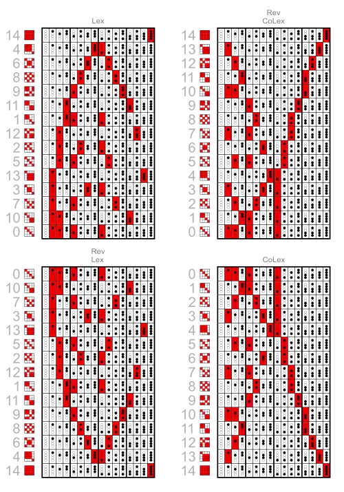 | The rows of the binary matrices are in CoLex order. (The white fields are 0s, colored fields are 1s. | |