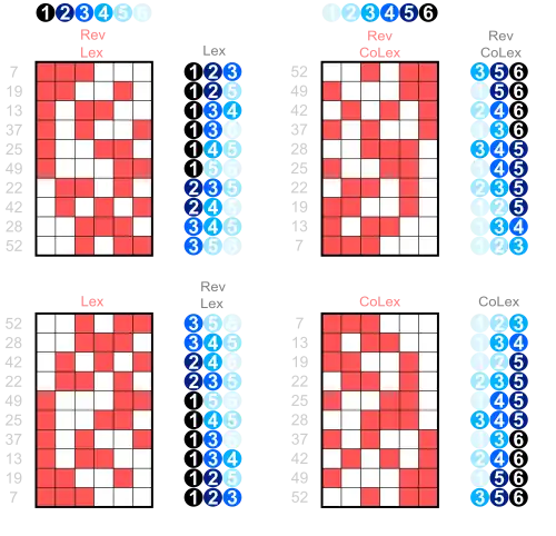 There are 3-subsets of a 5-set. The image on the right shows how the CoLex order corresponds to combinatorial numbers. | |||||||||||||||||||||||||||||||||||||||||||||||||||||||||||||||||||||||||||||||