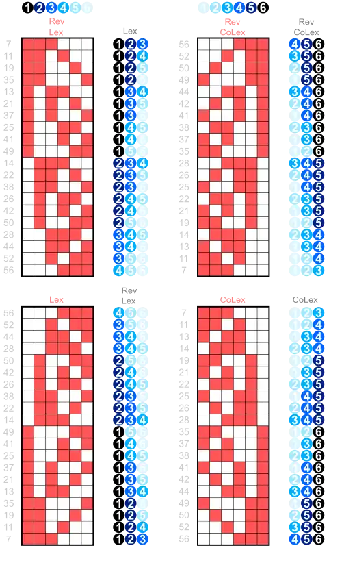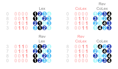 ![]() The binary matrix in CoLex order is the top left corner of the right matrix in the box below. |