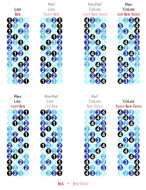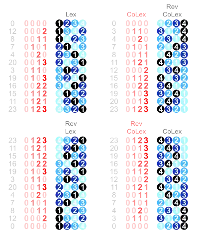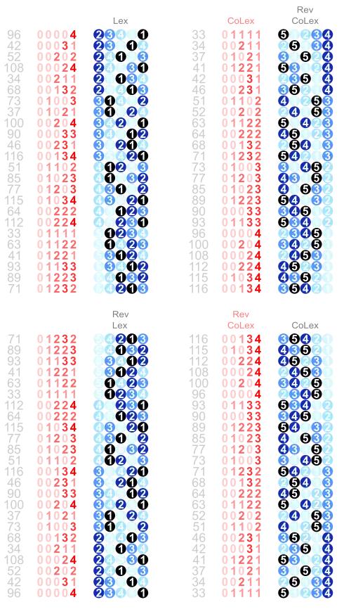 The reverse colex order of the permutations corresponds to the colex order of these left inversion counts, as seen in the following illustrations.