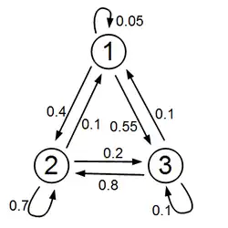 In the situation of Lemma 54.8 , we can find the eigendistribution by solving a system of linear equations. If we are dealing with a huge matrix (think about vertices), then such a computation time-consuming. Often, it is not necessary to know the eigendistribution precisely; it is enough to know a good approximation. For this, we may start with an arbitrary distribution, and we compute finitely many iterations. Because of Theorem 54.11 , we know that this method gives arbitrarily good approximations of the eigendistribution. For example, a search engine for the web generates for search item an ordered list of web pages where this search item occurs. How does this ordering arise? The true answer is, at least for the first entries, that it depends on how much someone has paid. Despite of this, it is a natural approach, and this is also the basis for the Page ranks, to consider the numerical ordering in the eigendistribution. The first entry is the one where most people would "finally“ end up when they follow with the same probability any possible link. This movement is modelled[1] by the stochastic matrix described in Example 54.5 .