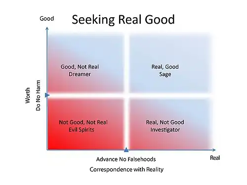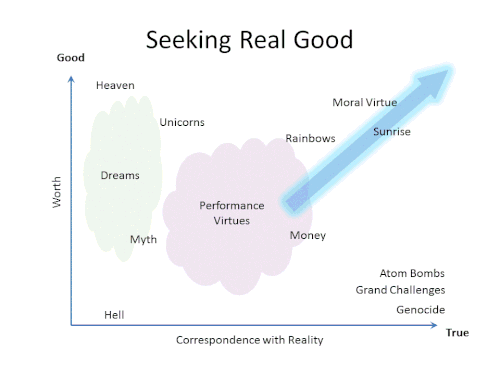 We must recognize that neither complete correspondence to reality nor absolute good can be achieved. It is best to consider pursuit of these elusive goals as an ongoing quest. The blue arrow indicates the direction of that quest, but not its end. Evaluating evidence, critical inquiry, seeking true beliefs, and scientific investigations assess correspondence with reality. I offer a tentative description of good and welcome your participation in improving that characterization.