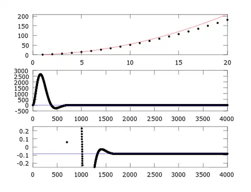 Top: The red line shows that the first 20 of the terms are reasonable approximations to the series 1+2+3+4+...