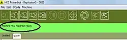 Selecting or scanning other serial ports - 8. “Machine HCC Makerbot ready” should appear in green at the top of the ReplicatorG screen. Also, more of the tools at the top of the ReplicatorG screen are available to use.