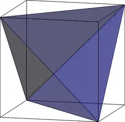 A tetrahedron can be inscribed within a cube such that four of the eight vertices of the cube are coincident with the four vertices of the tetrahedron, as shown in the diagram on the right.