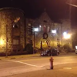 The Theater was built in the grand Victorian era and went all out without the expenses in mind.[3] The best materials where used; marble for the staircases, brass finishes, and leaded glass windows. The exterior made of huge rough cut Dunnville sandstone walls, the deep set windows, and dramatic arch entry all created a medieval feel.[3] The architecture of the building is awe-inspiring with how in depth and detailed the building actually is. The Theater is two stories tall and has a frontage of 80 feet with a depth of 90 feet.[4] Within the building as well is a colossal water powered pipe organ. With a total of nearly 1600 pipes and 28 stops, it is quite an eye piece. With buildings as big as the castle like theater upkeep and restoration is required.