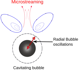 Owing to the various industrial and medical applications it promises, acoustic cavitation has gained vast importance in the past few decades. Megasonic cleaning which involves acoustic cavitation has been extensively used for the precision cleaning of the surfaces. In medicine, this phenomenon has been used for the removal of tumors. In the following sections acoustic cavitation and the related phenomena are discussed in more detail. Acoustic cavitation![]() On the other hand, if the acoustic pressure is large enough such that the negative half cycle has an amplitude large enough to force the liquid to go into tension, the cavities will expand rapidly to many times their original size. Consequently these bubbles collapse violently during the compression half-cycle thereby generating extremely high local temperatures (upto 5000K) and pressures(upto 1000 atm)[7]. One of the distinguishing features of bubble collapse is the development of a re-entrant jet due to an asymmetry such as a nearby wall. Such an asymmetry causes one side of the bubble to accelerate inward more rapidly than the opposite side and this leads to the development of a high-speed re-entrant microjet which penetrates the bubble. This microjet impinges the nearby wall at extremely high velocities. This leads to generation of higly localized and transient surface stresses. Repetition of this loading due to repeated collapses cause local surface fatigue failure and the subsequent detachment or flaking off of pieces of material. Bubble DynamicsThe main challenge in bubble dynamics is to determine the pressure and velocity fields in the two-fluid medium together with the motion of the bubble wall under the influence of acoustic pressure. It poses a two-phase hydrodynamical problem in which the two phases are coupled through a moving boundary. For a perfect gas bubble in equilibrium in a liquid: where = Gas pressure inside the bubble = Ambient liquid pressure = Surface tension of the liquid = Radius of the bubble = Critical radius