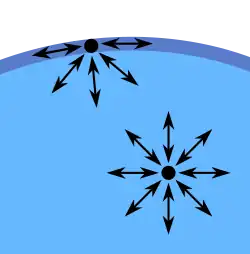 Surface tension phenomena occur at the interface of one liquid and another liquid, gas or a solid wall. The cohesive forces between molecules down into a liquid are shared with all neighboring atoms. Those on the surface have no neighboring atoms above, and exhibit stronger attractive forces upon their nearest neighbors on the surface. This enhancement of the intermolecular attractive forces at the surface is called surface tension. ![]() |