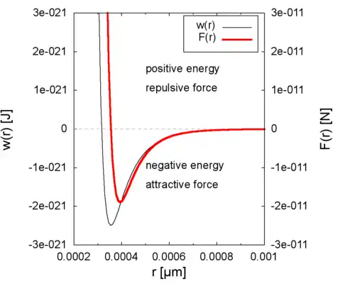 As the distance between the molecules becomes shorter, the forces between the molecules should be accounted properly. The intermolecular interaction between two molecules separated by a distance can be modeled by the Lennard-Jones pair pottential. where and are molecule dependent constants and they are equal to in which is the depth of the potential well (maximum attraction energy) and is the finite distance at which the inter-molecule potential is zero. is also called as the collision diameter. Inserting and in the above interaction potential reveals the other form of the Lennard-Jones pair pottential: The van der Waals potential is the negative contribution, which varies with the inverse 6th power of the distance . The intermolecular force is the derivative of the pair potential w.r.t. the distance. Hence, it can be seen that the first term is the attractive force, i.e. the van der Waals force. The second term is the repulsive force and it hinders that two atoms and / or molecules do not exist at the same location at an instant. Note that, force and potential energy are directly related. The potential energy (Lennard-Jones potential) is the negative of the work done by the net electromagnetic force moving the molecule towards another molecule to its given position in space from infinity. |