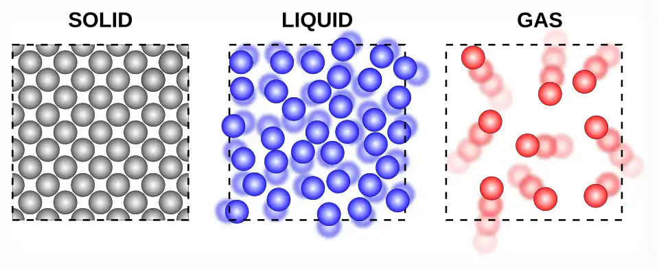In a solid, molecules form a regular lattice and oscillate around an equilibrium point. At this state, there is a strong attraction between the molecules and the kinetic energy of the molecules can not overcome this force in this phase of the matter. When enough energy is given to the molecules, e.g. by heating it, the matter melts and consequently becomes a liquid. The molecules gain kinetic energy as a result of added heat and start to move around in an irregular pattern. However, the density of liquids and solids, in other words the mean molecular distances at these two phases do not differ much from each other. When the liquid vaporizes and turns into the gas phase, the density drastically drops as the molecules starts to move freely between the intermolecular collisions.