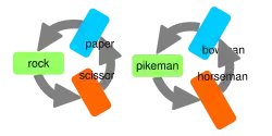 Strength of different type of military units or weapons cannot be simply compared as a scalar property. Different units can be good against different targets. The property to be good against is not always a transitive relation. The situation may be similar to game Rock-paper-scissors where rock beats scissor, scissor beats paper, but paper beats rock. Analogically, archers may be prone to attack of cavalry, which can be stopped by phalanx of pikemen, which can be, on the other hand, destroyed by archers.