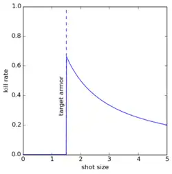 There is a compromise between penetration capability of a weapon and its cost effectiveness. Typical situation is comparison of a machine gun and a canon. A machine gun fire, which fire 600 rounds per minute (rpm) rpm can kill a lot of unprotected targets. Cannon ( 1 rpm) can kill maximally one target. However, the machine gun is totally ineffective against a well armored target. Lets assume that we are limited by total firepower defined (e.g.) mass (or energy) off all projectiles fired in one minute. Assume also that each shot can kill just one target. Than kill rate would depend on size (mass, energy) of one shot and armor of targets as follows: