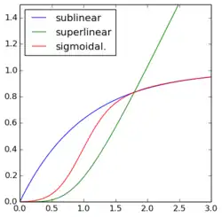 - superlinear - Effect of additional unit of force is greater than previous one. Typical is threshold behaviour, where is necessary some minimal amount of force to achieve a any considerable effect, after which the response is almost linear. E.g. penetration of defensive front line in trench warfare.