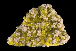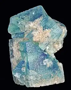 Fluorapatite, a sample of which is shown at right, is a mineral with the formula Ca5(PO4)3F (calcium fluorophosphate) that is the most common phosphate mineral occurring widely as an accessory mineral in igneous rocks, in calcium rich metamorphic rocks, as a detrital or diagenic mineral in sedimentary rocks, is an essential component of phosphorite ore deposits and occurs as a residual mineral in lateritic soils.[12]
