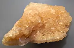 Calcite on the right is a common calcium carbonate mineral that occurs in orange.