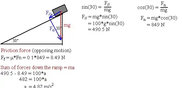 On a ramp, the interesting directions are along the ramp and straight into the ramp. The gravitational force (weight) is straight down, but we must separate it into a component along the ramp (F parallel or F[sub]//[/sub]) and a component into the ramp (normal force, Fn). Consider a box with mass 100 kg on a ramp. The coefficient of friction between the ramp and the box is 0.1. With what acceleration will it slide along the ramp?
