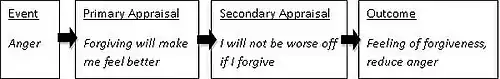 Before forgiveness is felt, usually forms of negative emotions such as anger or sadness are felt which arise from appraisal of harm from a situation. Forgiveness appraisal recognises this harm was present but assesses that ruminating on this will be of more harm or achieve no good purpose and so letting go is beneficial. Other cognitive theorists build on this theory adding more complex appraisal processes to reach an emotion. Ellsworth and Smith build on this add to this by adding an explanation that any emotion is a product of a complex process of interpretations from a situation (Keltner, Elssworth & Edwars, 1993). |