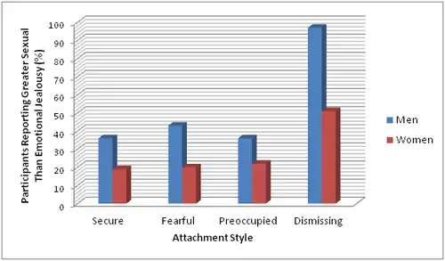 Giving consideration to this Levy and Kelly (2010) provide an alternate explanation which may account for sex differences in jealousy arousal. The authors reflect on literature which indicates that men more so than women are likely to minimise the need for intimacy and emotional dependency, and emphasise the need for self-reliance, the authors highlight that these traits are characteristic of insecure and avoidant attachment styles. Additionally, individuals with these attachment styles are also more likely to display a tendency towards casual and indiscriminate sexual activity (Bartholomew & Horowitz, 1991). Proposing that sex differences in jealousy are the result of differences in attachment style, Levy and Kelly examined levels of predicted distress among men and women relative to sexual and emotional infidelity within the context of attachment styles. Subsequent to measuring attachment style (secure, dismissive, fearful/avoidant or preoccupied), the authors presented a culturally diverse sample of 416 undergraduates with an infidelity questionnaire (designed by Buss et al., 1992). The data analysis confirmed support for the hypothesis; that individuals assessed to have a dismissive attachment style were more likely to report sexual infidelity as jealousy evoking compared to those with a secure attachment style. The findings showed that men were more likely to endorse dismissive attachment style. Comparably, the results showed that 73.3 percent of men and women who endorsed secure attachment styles reported increased levels of jealousy associated with an emotional infidelity.