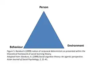 Within Bandura's (1978) reciprocal determination theory, learning does not occur in isolation, it is believed to occur within multi-directional interactions that are established between behaviour, cognition and other internal factors, and the environment. The theory of reciprocal determination proposes that each of these three factors are not only affected by the other factors but also has the capability to be affected in return (Bandura, 1978).