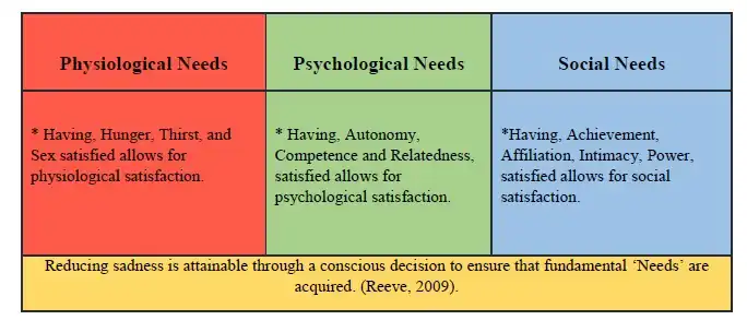 The following book chapter, Sadness will describe potential explanations for feelings of sadness. This chapter will explain physiological factors that are associated with emotions such as sadeness and will suggest ways to manage emotions. “…emotions urge and direct behaviour or, in other words, that emotions have motivational character (Parkinson & Colman).” Motivation is described as the arousal that arises from the importance of an objective and the actions necessary to attain the outcome. If the goal is too hard to accomplish then arousal will fade. This can lead to disenchantment (Keltner & Gross, 1999). Goals and motivational arousal is bought upon from psychological, physical and social needs. If the required needs are not acquired, then emotional discomfort like sadness will arise (Reeve,1999). It is important to find strategies to cope with negative emotions so they don't become overwhelming. Feelings of negativity often leave people feeling despaired and therefore less motivated. A positive attitude allows people to think more clear and have more energy leading to more motivation (Lane, et al., 1997). |