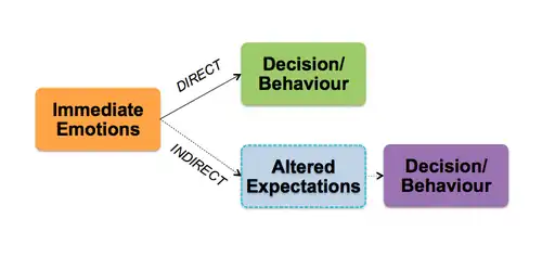 The second way in which emotion influences decision-making is through immediate emotions. Immediate emotions are experienced at the same time that a decision is being made, and can either exert a direct or indirect impact on decisions or behaviour (Loewenstein & Lerner, 2009). With the direct impacts of immediate emotions, the immediate emotions exert a direct impact on the decision or behaviour (Loewenstein & Lerner, 2009). Conversely, indirect impacts of immediate emotions alter a decision maker’s expectations of the probability or desirability of future consequences, by changing the way that these consequences are processed (Loewenstein & Lerner, 2009). See Figure 2. process graphic for immediate emotions diagram.