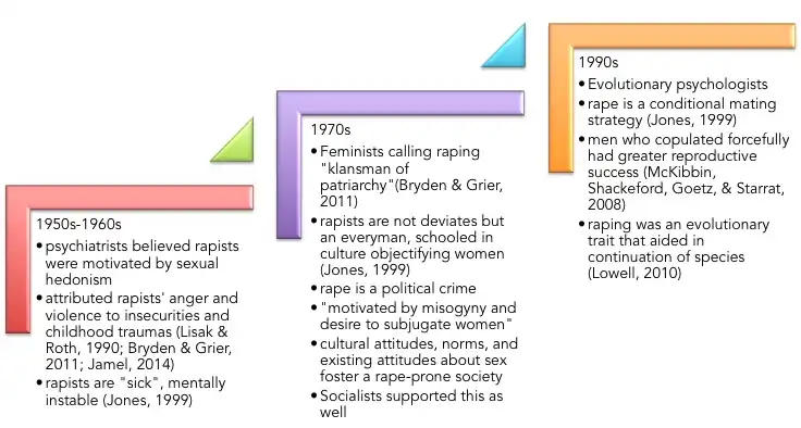 Scholarly exploration of rapist motivations began in the 1950s and 1960s. The Figure 2 timeline highlights the key points of these theories.