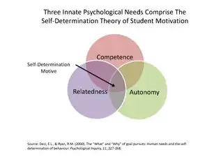 Self-determination theory is used in the explanation of motivational behaviour, proposed by Deci and Ryan (2000). Self-determination theory focuses on three innate psychological needs that encourage individuals toward the instigation of behaviour. The three elements or basic psychological needs include autonomy, competence and relatedness (Deci & Ryan, 2000). Self-determination theory utilises empirical research to explore individuals' innate growth tendencies and inherent psychological needs for self-motivation, through the examination of conditions that facilitate positive development ((Deci & Ryan, 2000). Additionally, research indicates that teachers who meet students’ basic needs of autonomy, competence and relatedness cultivate motivation and increase positive adjustment in school (Deci et al., 1991).