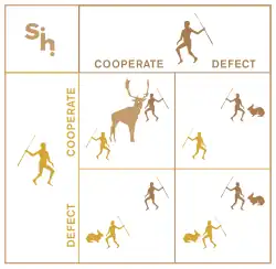 The Stag Hunt - "In models that use the "stag hunt" game to represent mutually beneficial, but risky, cooperation, guilt can benefit actors by stabilising such cooperative behaviour. In these types of interactions, it always benefits actors to cooperate when their partners do as well, even in the face of temptation to do otherwise. An emotion, like guilt, that promotes cooperation will then provide individual benefits to any actor in a generally cooperative group. Example, two actors have agreed to hunt a stag together, or cooperate, but one is tempted to hunt a hare instead (to seek short term, less risky, payoff) if anticipation of guilt keeps the actor focused on the stag hunt and their partner pulls through, they will eventually receive greater rewards for sticking to the larger, if riskier, joint project" (Rosenstock & O'Connor, 2018).