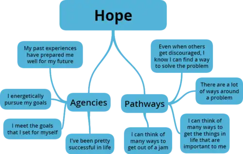 Hope theory, developed by C.R. Snyder, is a model composed of two processes. These processes detail hope as a positive motivational state, based on a combination of agency thinking (goal-directed motivation) and pathway thinking (production of plausible routes to desired goals) (Snyder, 2002). Hope was labelled by Snyder (2002) as, “primarily a way of thinking, with feelings playing an important, albeit contributory role” (p. 249). Hopeful thinking is characterised by an individual centring an imagined, future-oriented, but a valuable target to achieve (Gallagher & Lopez, 2018). This value can vary, with higher valued goals playing a meaningful and substantial role in the goal-setters life, whereas less valued goals having a higher tendency to be discarded. Lastly, hope theory emphasises the importance of thought processes in comparison to emotions (Gallagher & Lopez, 2018). Emotions play a role in feedback; positive emotions indicate progress or success and negative emotions indicate failure (Snyder, 2002).